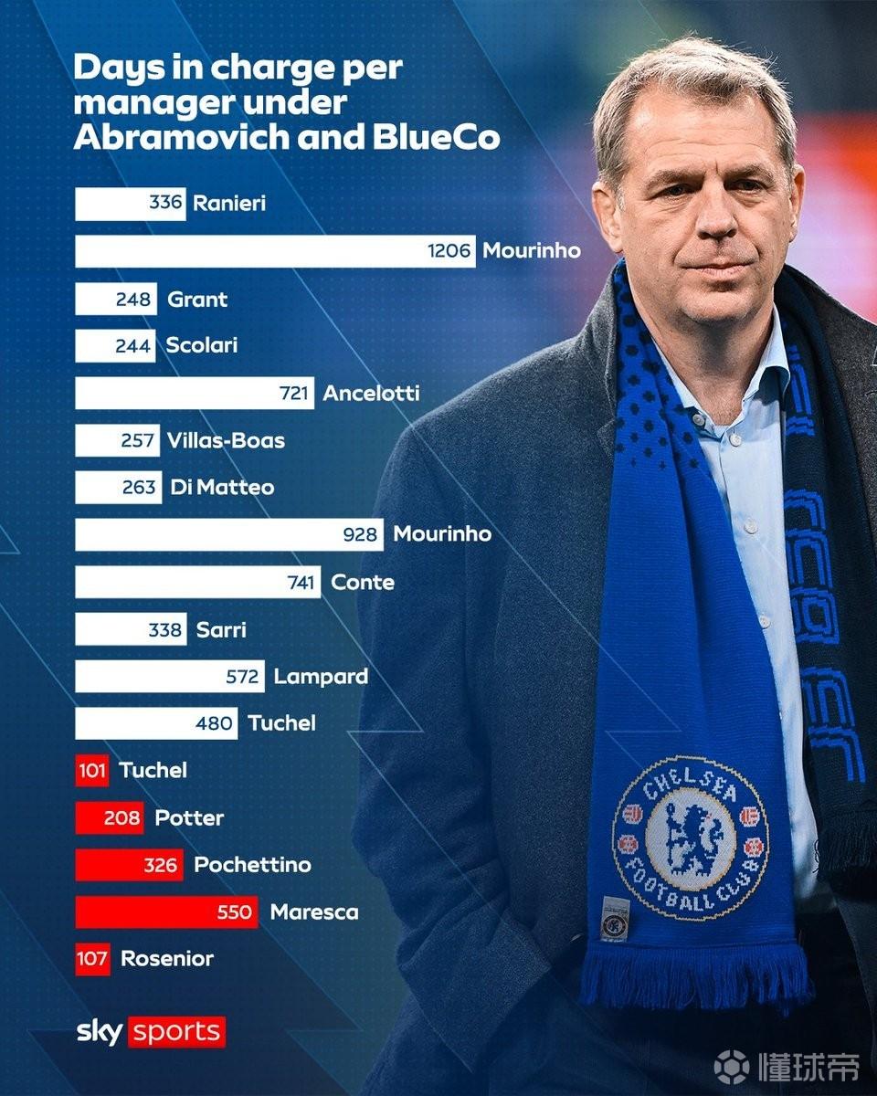 根据天空体育的统计,在阿布时代,切尔西历任主帅的平均在任天数达到了528.67天,而这一数据在伯利和清湖资本入主后骤降至258.4天。